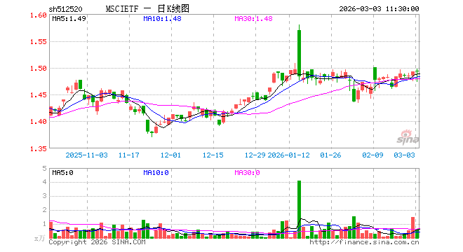 3月3日,截止午间收盘,MSCIETF(512520)涨0.00%,报1.492元,成交额95.77万元。MSCIETF(512520)重仓股方面,贵州茅台截止午盘跌0.76%,宁德时代涨2.71%,招商银行涨1.66%,工业富联涨1.93%,中国平安涨1.32%,紫金矿业跌2.97%,中际旭创涨1.96%,寒武纪跌2.67%,长江电力涨1.58%,农业银行涨3.24%。